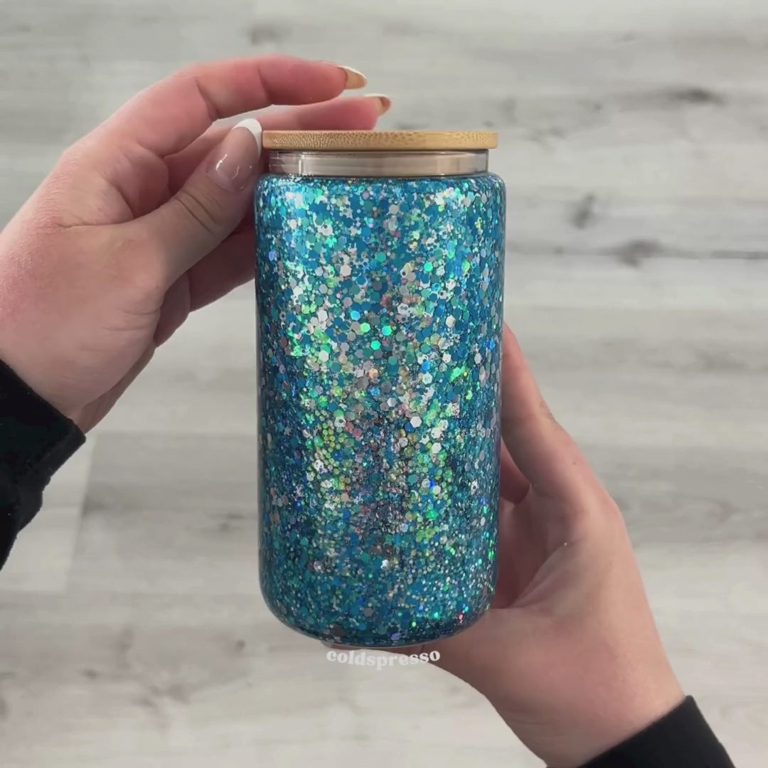 16 oz Snow Globe Glass Cup with Blue and Silver Glitter